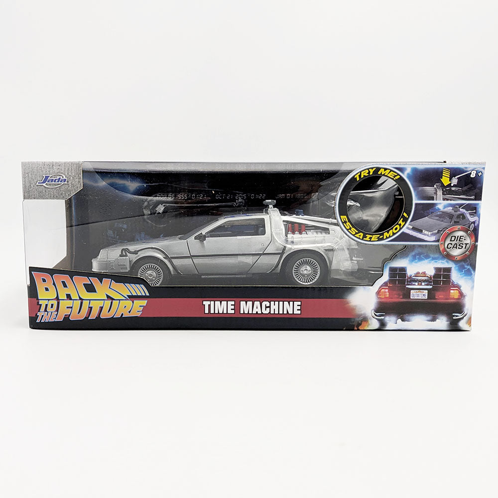 From Jada Toys. Travel back in time with one of the most iconic vehicles in the Hollywood Rides lineup: the Time Machine as seen in Back to the Future (1985). Featuring a die-cast body, rubber tires and light-up feature, this 1:24 scale vehicle is a must have in any collection!