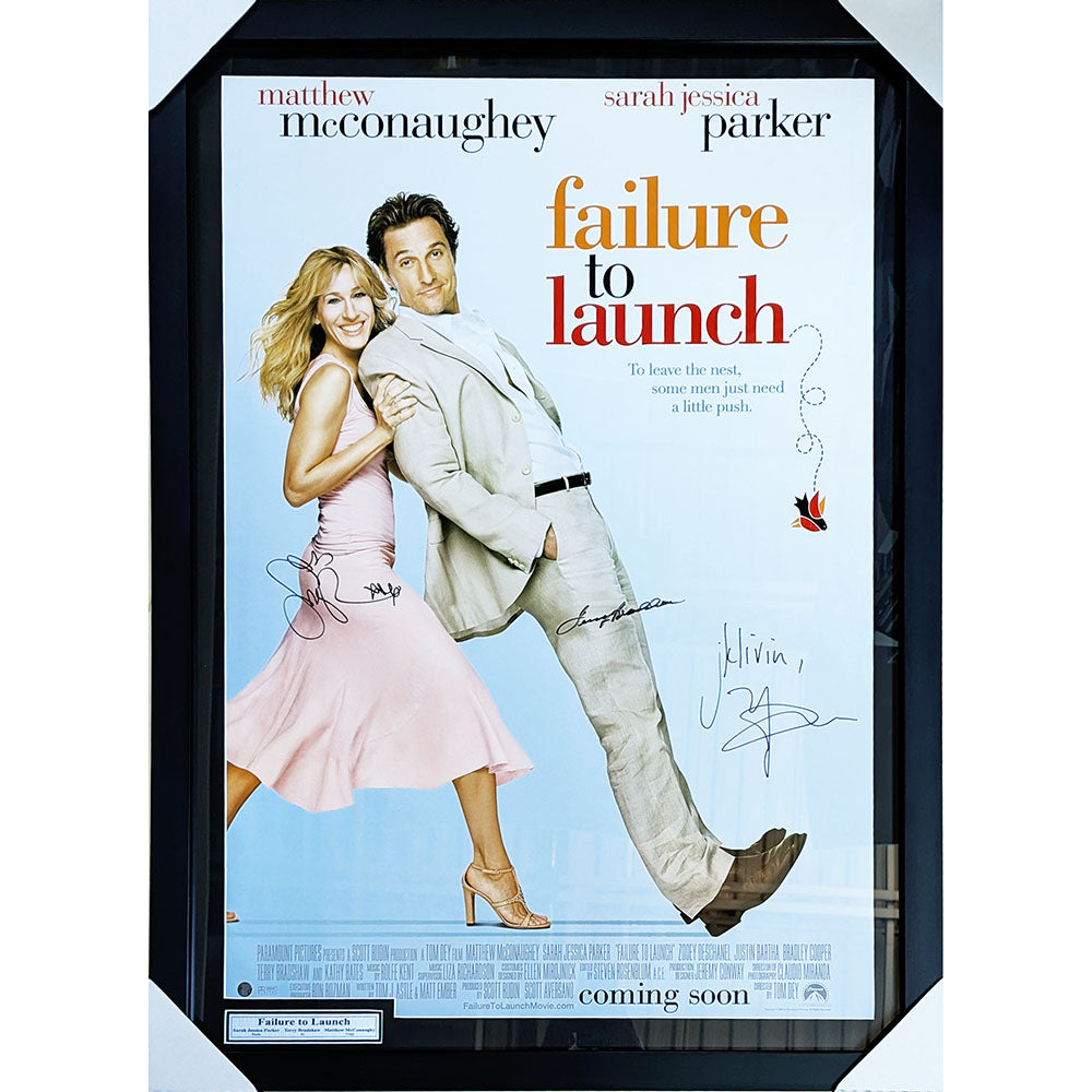 Get this amazing framed 27X40 "Failure to Launch" movie poster that has been autographed by the stars of the film - Matthew McConaughey, Sarah Jessica Parker & Terry Bradshaw. This is an authentic original poster issued directly by the distributor to promote the film's theatrical release in 2006. Finished frame size is 31X43.
